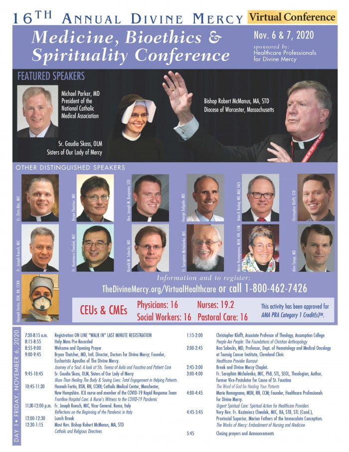 Healthcare Professionals for Divine Mercy are hosting their next Medicine, Bioethics and Spirituality Conference on November 6th and 7th as a virtual conference this year. This conference is open to anyone interested in healthcare and the role of bioethical principles as well as spirituality that help bring forth definitive healing to the infirm and those suffering in any way. This conference will be of particular importance for healthcare professionals who may also obtain continuing medical education credits. Conference registration can be completed online at TheDivineMercy.org/VirtualHealthcare or by calling 1-800-462-7426.