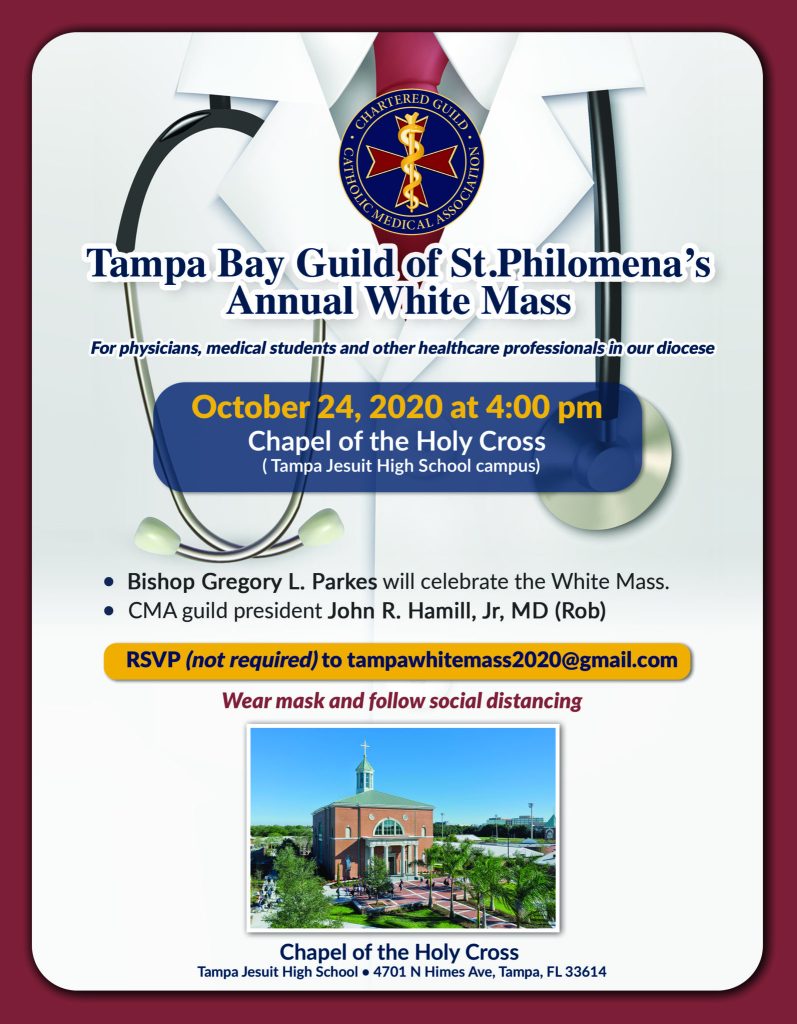 Tampa Bay Guild of St. Philomena will celebrate the White Mass at the Chapel of the Holy Cross in Tampa Oct. 24 at 4 p.m. with Bishop Gregory Parkes as the main celebrant. RSVP requested ( but not required) to : tampawhitemass2020@gmail.com