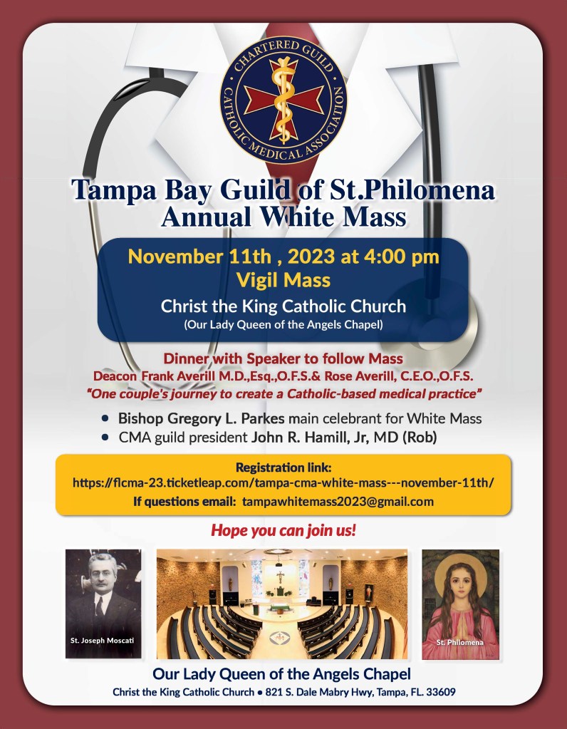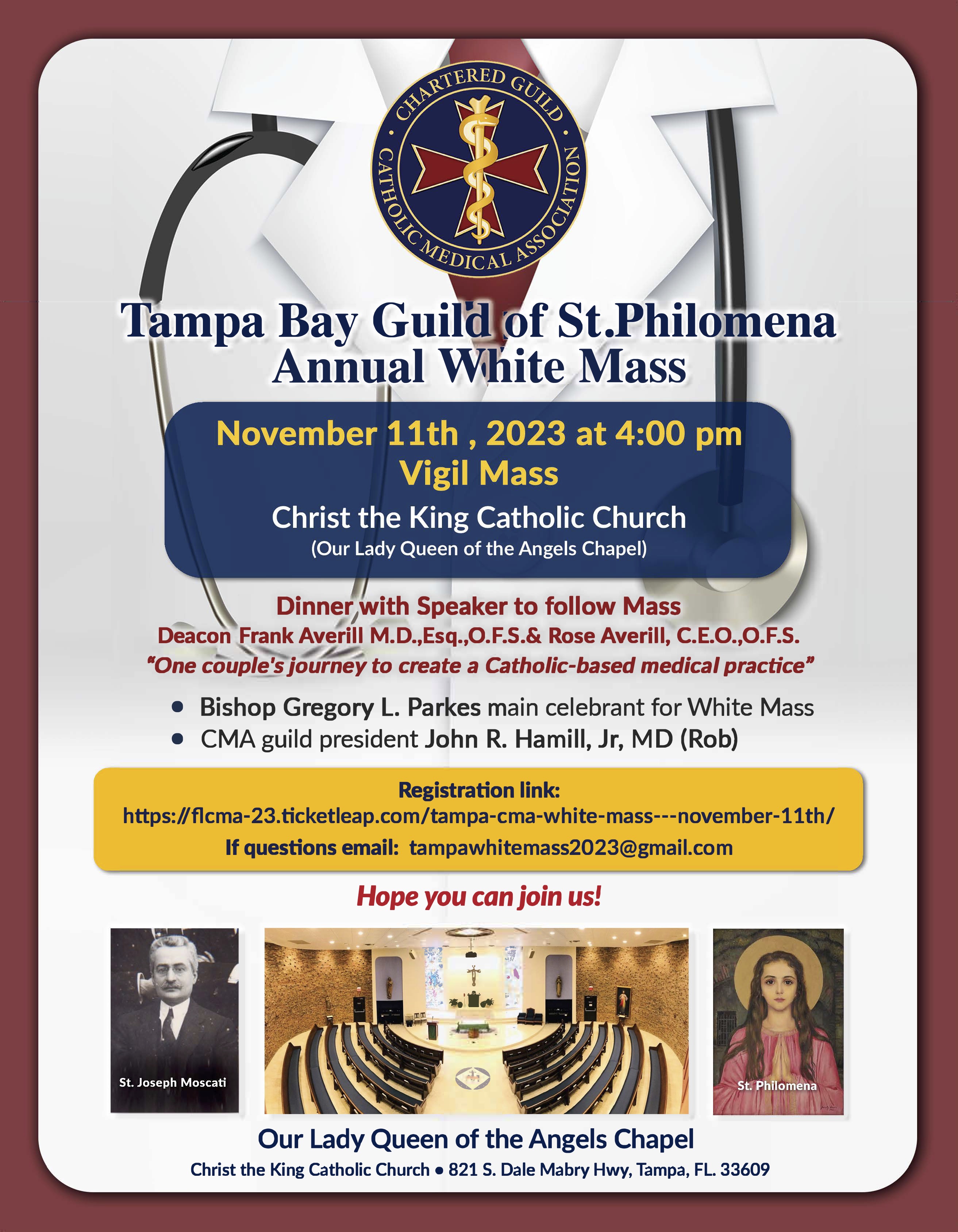 The Tampa Bay Guild of St. Philomena is hosting its annual White Mass for healthcare professionals and medical students on November 11, 2023 at 4pm with Bishop Gregory Parkes celebrating at Our Lady Queen of the Angels Chapel in Christ the King Catholic Church in Tampa, FL. Deacon Frank Averill, M.D., Esq, O.F.S. & Rose Averill, O.F.S. will be our dynamic speakers at the dinner following Mass. Their presentation is called: “One Couple’s Journey To Create a Catholic-based Medical Practice. ” See attached flyer.